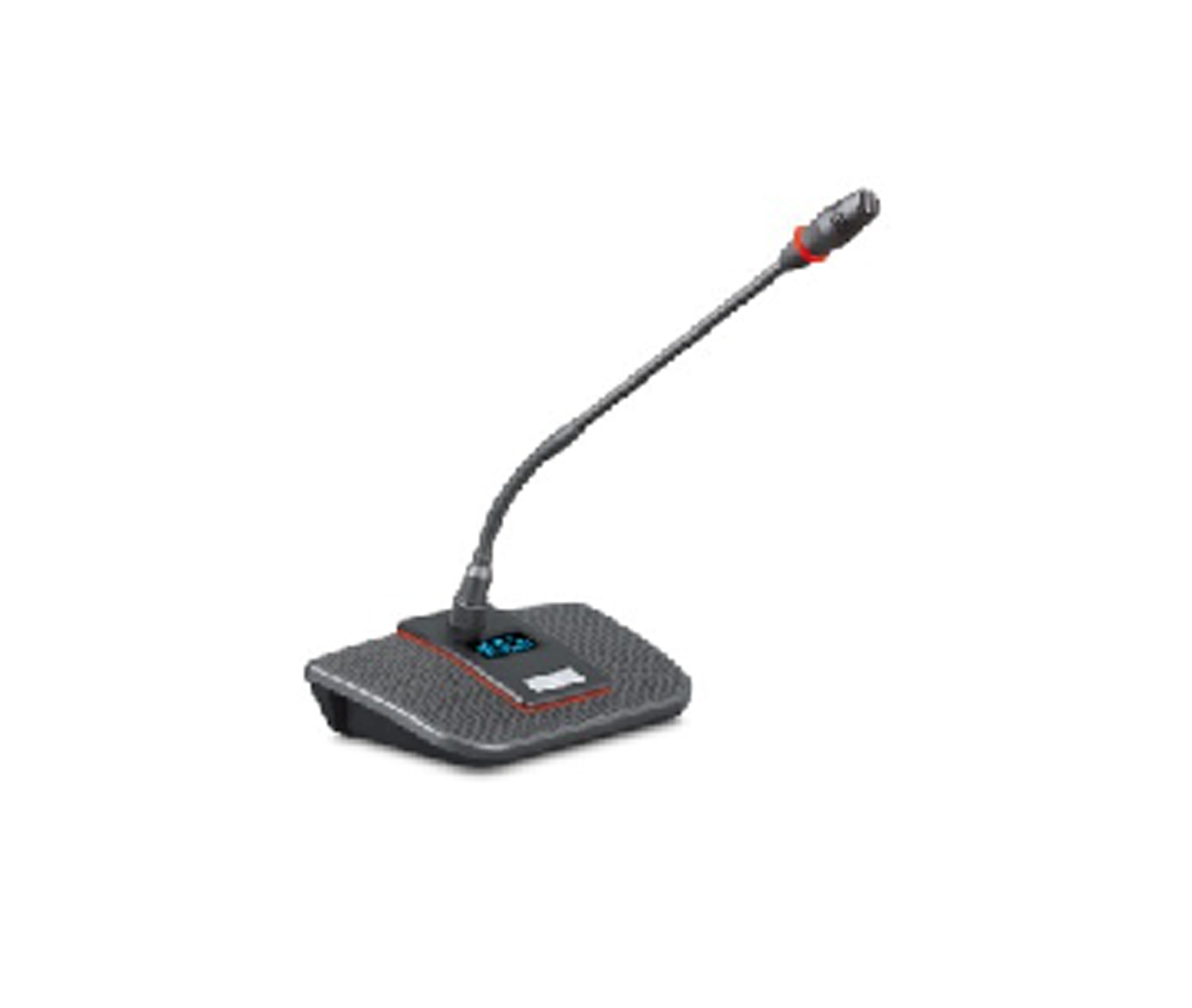配备可插拔式鹅颈话筒带红色发言指示光环;高强度阳极氧化铝合金面板,美观、大方、耐用;专业高保真、单一高指向性电容咪芯,发言距离可达10-40cm时声音清晰,配备高速反馈抑制器可进一步增加拾音距离到50CM-80CM;自带2.1米8P公头电缆和8P母座,单元之间直接手拉手连接,方便安装;话筒单元由系统主机提供DC24V电源,属于安全范围,话筒支持热插拔,单元之间可接入小型扩展电源,达到单线长距离分段式供电;话筒支持第三方中控实现视频跟踪、打开关闭,中控与会议系统主机使用工业RS232通讯协议代码;打开话筒,扬声器自动静音功能,内置扬声器,旋钮式扬声器音量大小调节;话筒单元具备3.5MM监听耳机插孔,可随时调节音量大小,可连接录音设备或监听耳机;话筒开关使用汽车级别橡胶开关按键,具有持久耐用,轻微机械声特点,配备长条发言状态指示光环,具备待机灯,当指示灯亮起情况下,话筒即可打开,熄灭则话筒是处于不能打开;话筒具有1.3寸OLED蓝光广视角、高对比度显示屏,可实时显示当前会议模式、话筒ID号、话筒发言状态、发言计时、发言倒计时,方便与会者掌握时间,提高会议效率。
